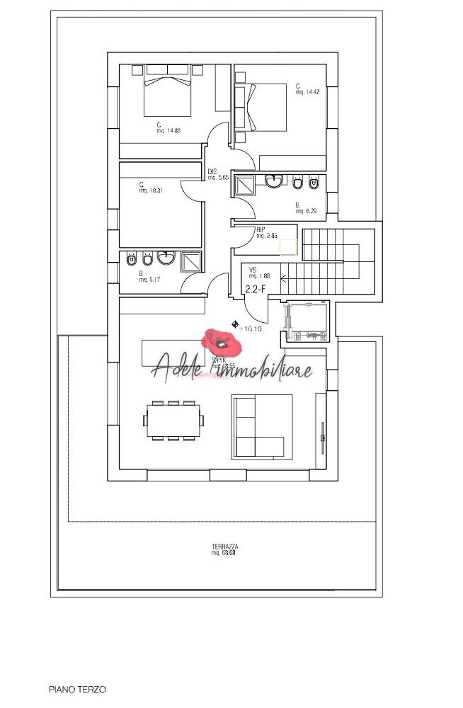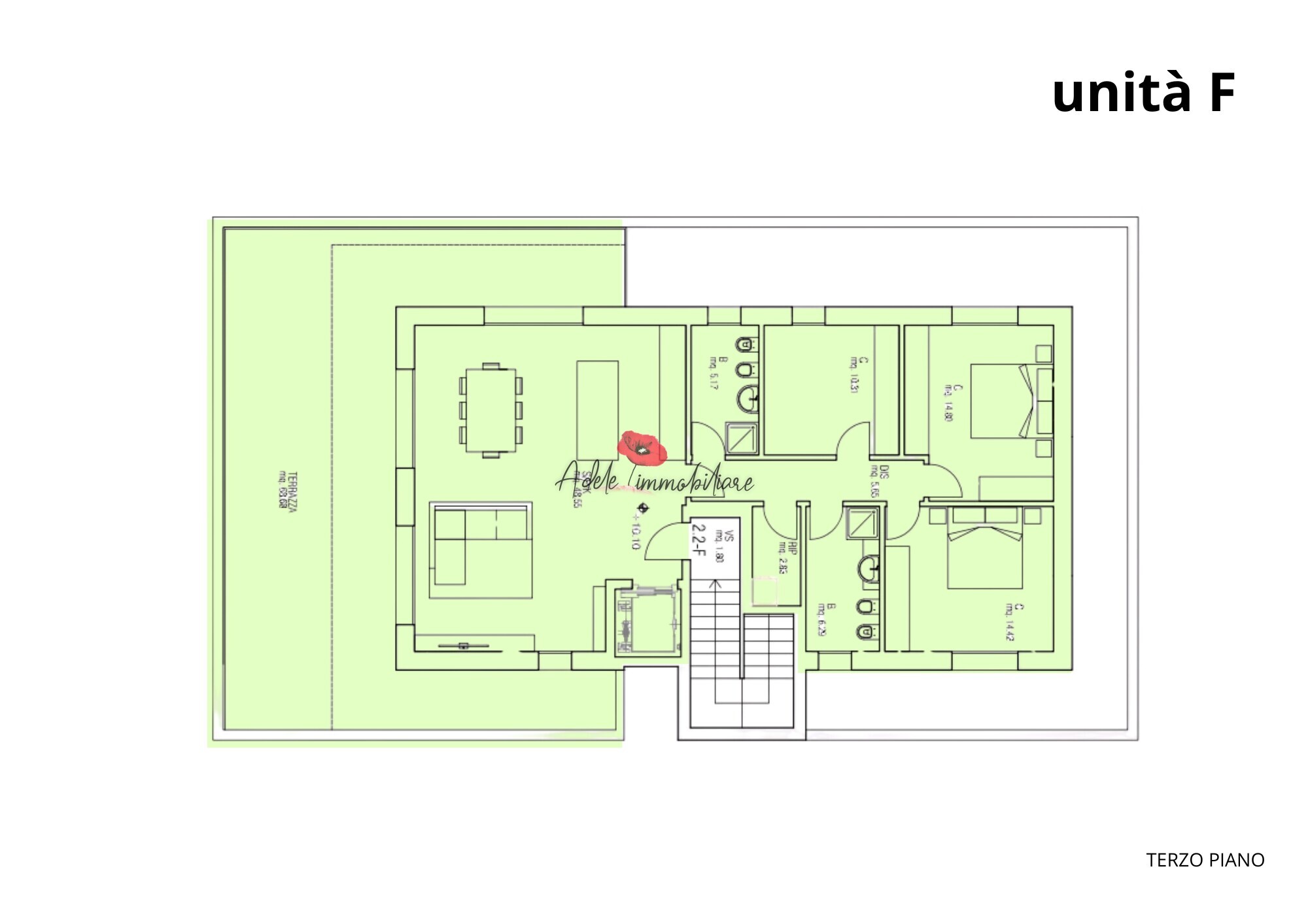 L’attico dell’edificio 2.2, (unità F) occupa l’intero terzo piano ed ha l’ascensore direttamente all’interno della zona giorno caratterizzata da pareti vetrate scorrevoli ed accesso alla terrazza di quasi 70 mq da personalizzare e realizzare una area salotto, solarium con area wellness, cucina esterna e pranzo, disimpegno per la zona notte dove si trovano 2 camere matrimoniali, 1 camera singola, 2 bagni finestrati con doccia e 1 ripostiglio/lavanderia oltre duna seconda grande terrazza.